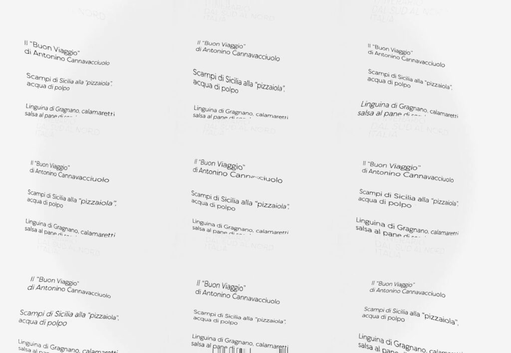 Il primo menu degustazione, chiamato "Itinerario", racconta la storia di un giovane chef che si sposta dalla Penisola Sorrentina alle sponde del Lago d'Orta. È un percorso che unisce i sapori del mare tipici del Sud con quelli più dolci e delicati del lago, rappresentando il viaggio personale e professionale di Antonino Cannavacciuolo.