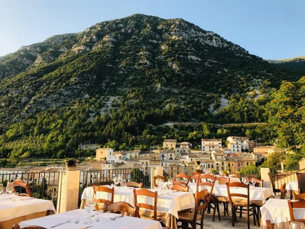 Passeggiando tra le strette vie, si scoprono botteghe artigiane e antiche trattorie che custodiscono le sapienti tradizioni culinarie abruzzesi. La cucina locale è robusta e saporita, legata ai prodotti della terra e della pastorizia. Imperdibili sono i formaggi di alta quota, le salsicce, e gli immancabili arrosticini, spiedini di carne di pecora cotti alla brace, un vero simbolo della gastronomia abruzzese. Si possono gustare anche patate e castagne cotte intere sotto la brace, i “cazzarielli” (simili agli gnocchi, spesso serviti con fagioli o ragù), ricche zuppe di legumi pregiati, la “pecora alla callara” (uno stufato legato alla transumanza) e la “fracchiata” (simile alla polenta). Per concludere in dolcezza, ci sono squisiti dolci ripieni di mandorle e marmellata d'uva. Il tutto accompagnato dai pregiati e corposi vini della zona, su tutti il Montepulciano d'Abruzzo, e dai deliziosi liquori come quello di Genziana.