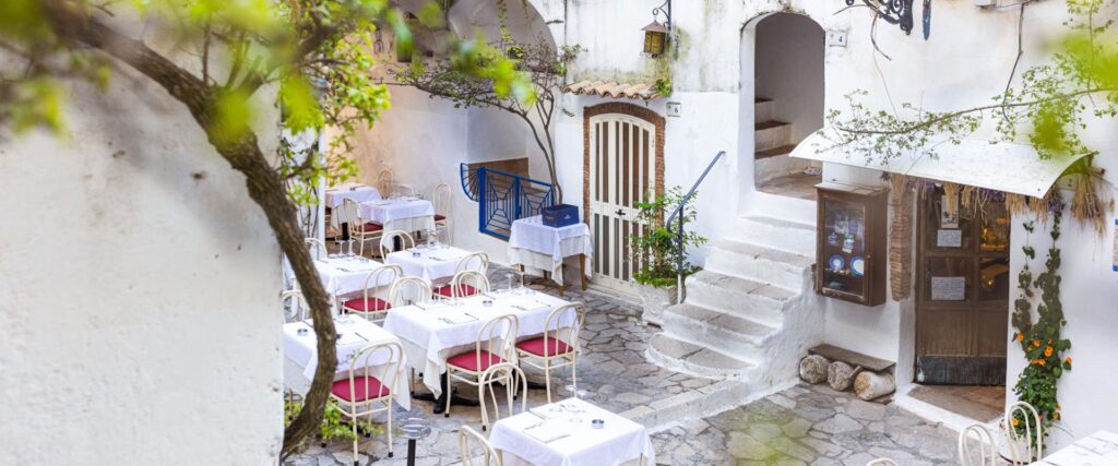 La Ricciola Saracena si distingue per la sua location suggestiva, incastonata in uno splendido vicolo con vista mare, che evoca i colori e l'atmosfera dei villaggi greci. Un tempo antico frantoio, il ristorante ha saputo reinventarsi mantenendo un legame con la storia del luogo, utilizzando arredi realizzati con materiali di recupero. La cucina proposta è fortemente legata alla tradizione e al territorio, con piatti semplici ma ricchi di sapore che esaltano il pesce di mare freschissimo. Piatti come i Ravioli di ricotta di bufala con pomodorini gialli e colatura di alici di Anzio o il Pesce spada con caponatina di melanzane sono esempi della loro proposta culinaria.